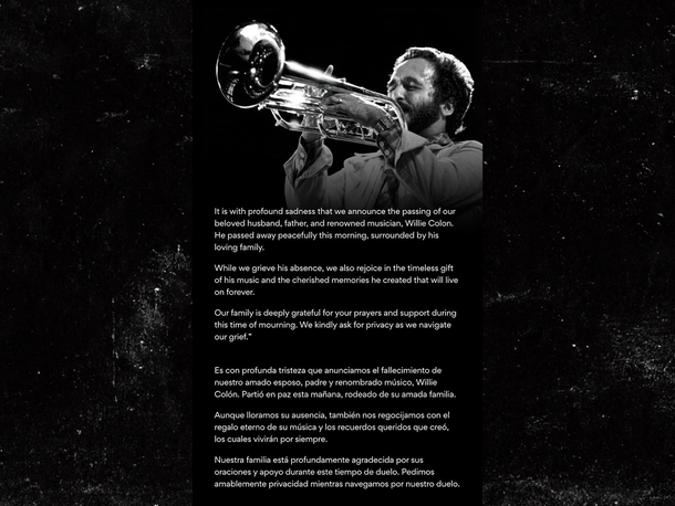 В субботу утром на странице музыканта в соцсетях появилось заявление, подтверждающее печальную новость. В нём говорится: «С глубокой печалью мы сообщаем о кончине нашего любимого мужа, отца и прославленного музыканта Уилли Колона».
