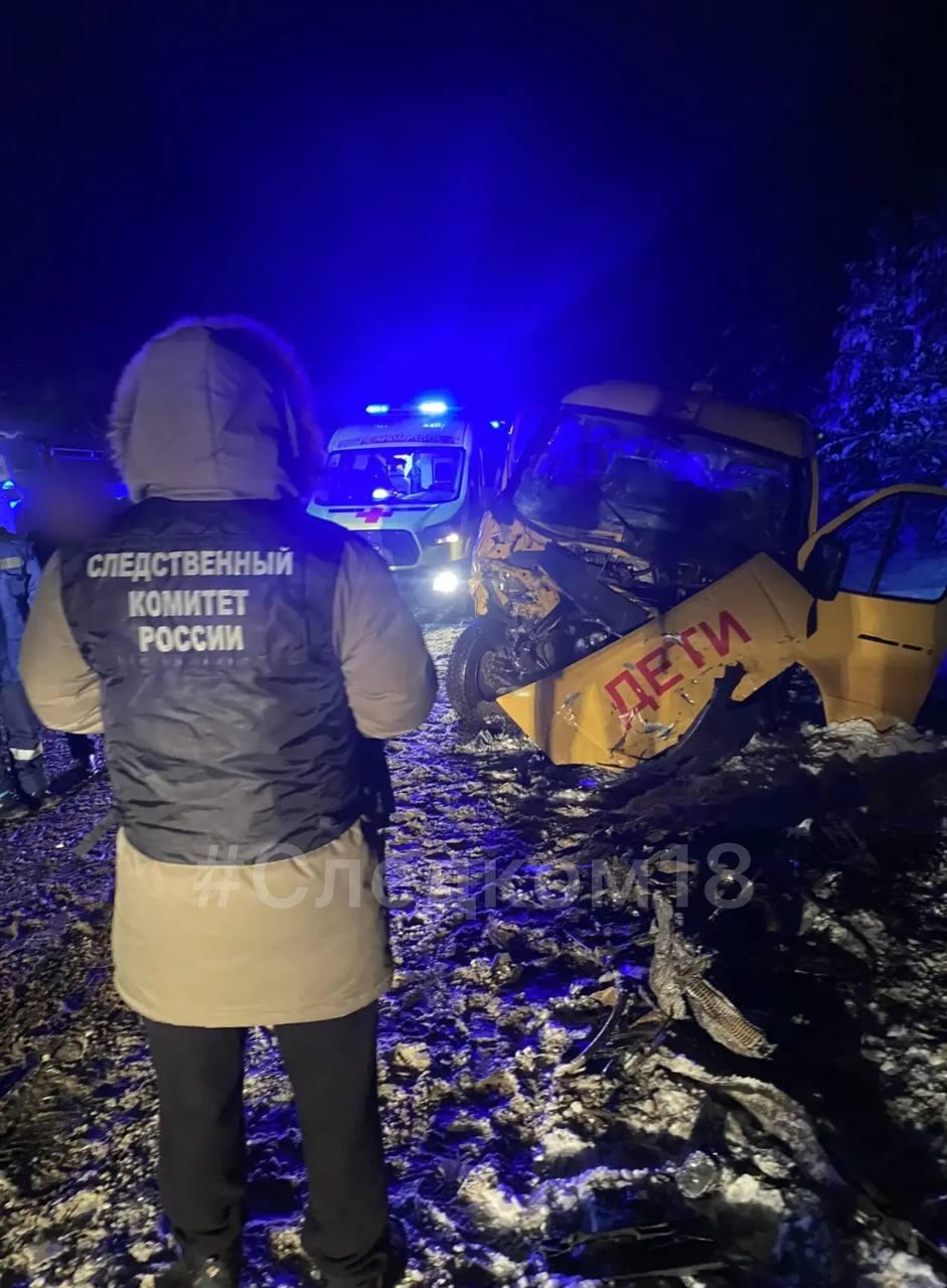 ДТП произошло в вечернее время 21 декабря на автодороге Ижевск — Ува. По предварительным данным, водитель школьного автобуса решил совершить обгон в неположенном месте, что привело к столкновению со встречным автомобилем Changan. В аварии пострадали 14 человек, включая восьмерых детей. Десять пострадавших были доставлены в медицинские учреждения. Один ребенок находится в тяжелом состоянии, ему провели оперативное вмешательство. Состояние остальных оценивается как травмы средней степени тяжести.